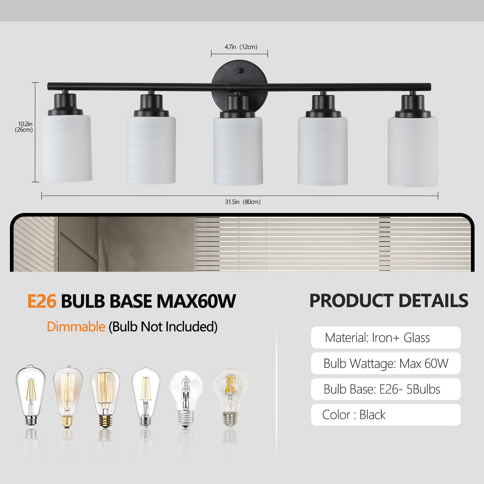 Black 5-Light Vanity Light Fixture with Milky White Glass Shades for Bathroom Mirror