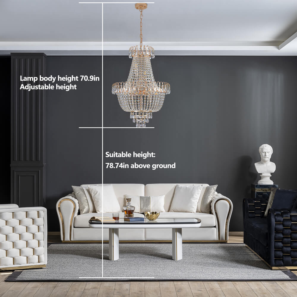 Step into a world of luxury with our 22-Inch Gold Crystal Chandelier. This magnificent fixture blends contemporary sophistication with classic European Empire design, making it the ultimate statement piece for your home. Whether installed in a grand foyer, above a dining table, or in a spacious living room, its sparkling presence transforms any environment into a palace of elegance.
