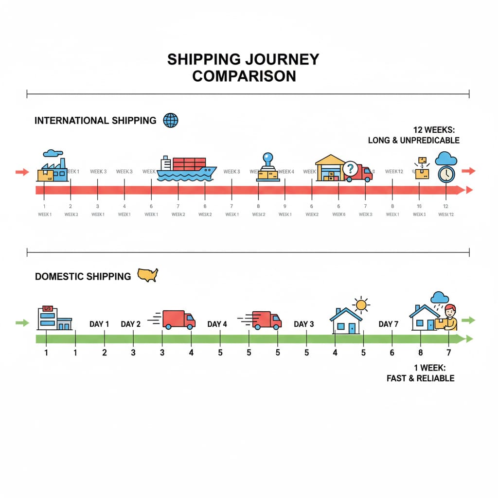 If you’ve ever tried to source directly from overseas, this timeline will feel painfully familiar. It’s a long and uncertain path filled with potential delays at every step: