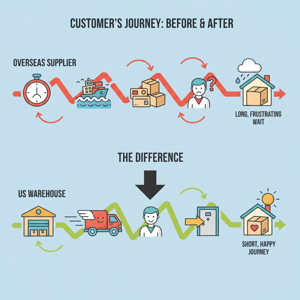 Now, let’s look at the new reality. When you partner with a supplier stocking goods in the US, the journey is radically simplified: